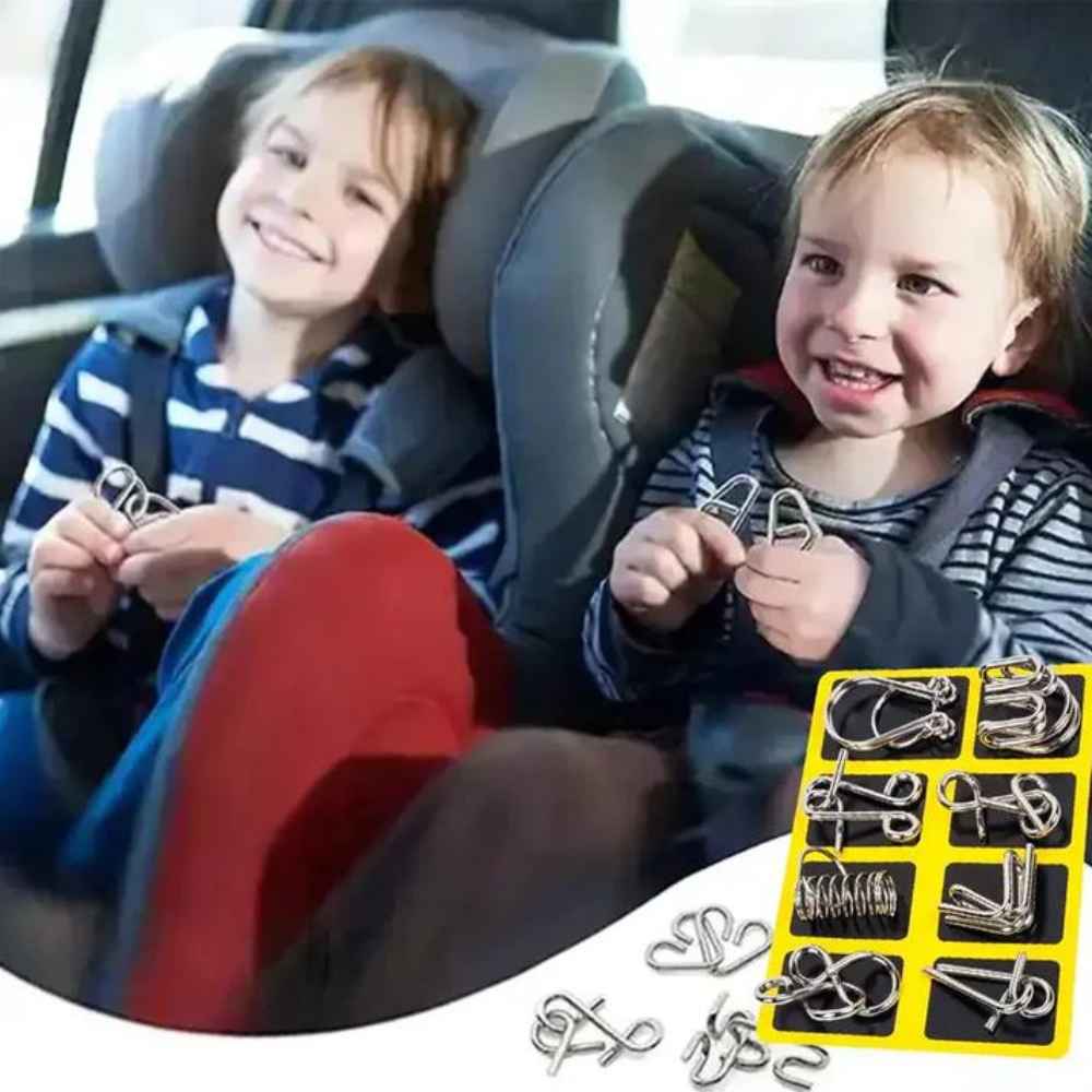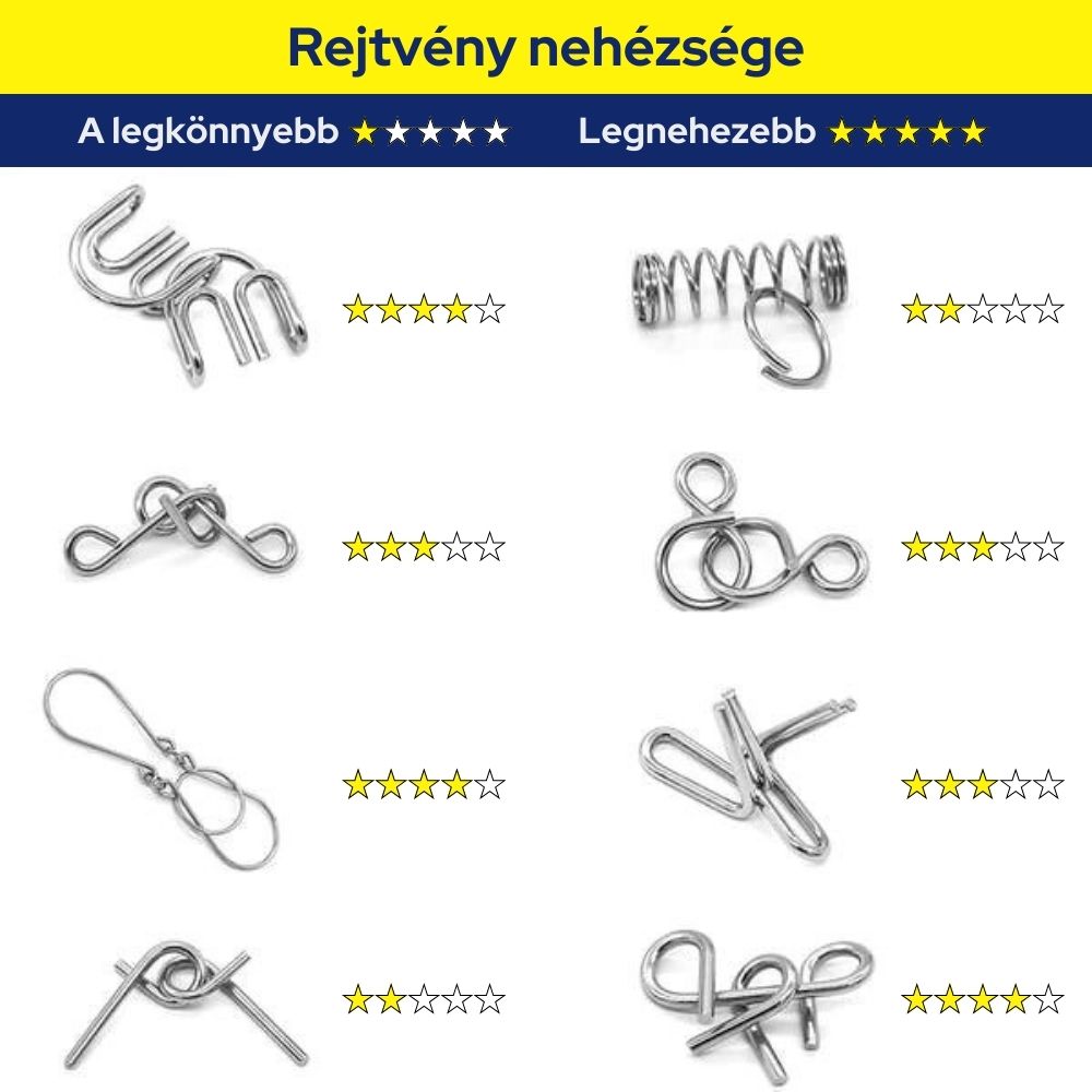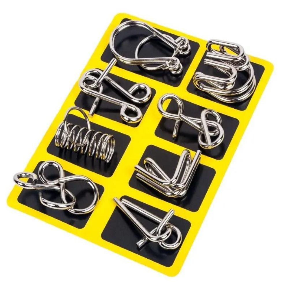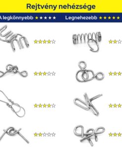 A csomag 16 fémhuzalos rejtvényt tartalmaz, amelyekhez egy praktikus tárolótáska is jár. Egyszerű, mégis magával ragadó, különálló, összekapcsolt fémdarabok az élvezetes kihívásért.
